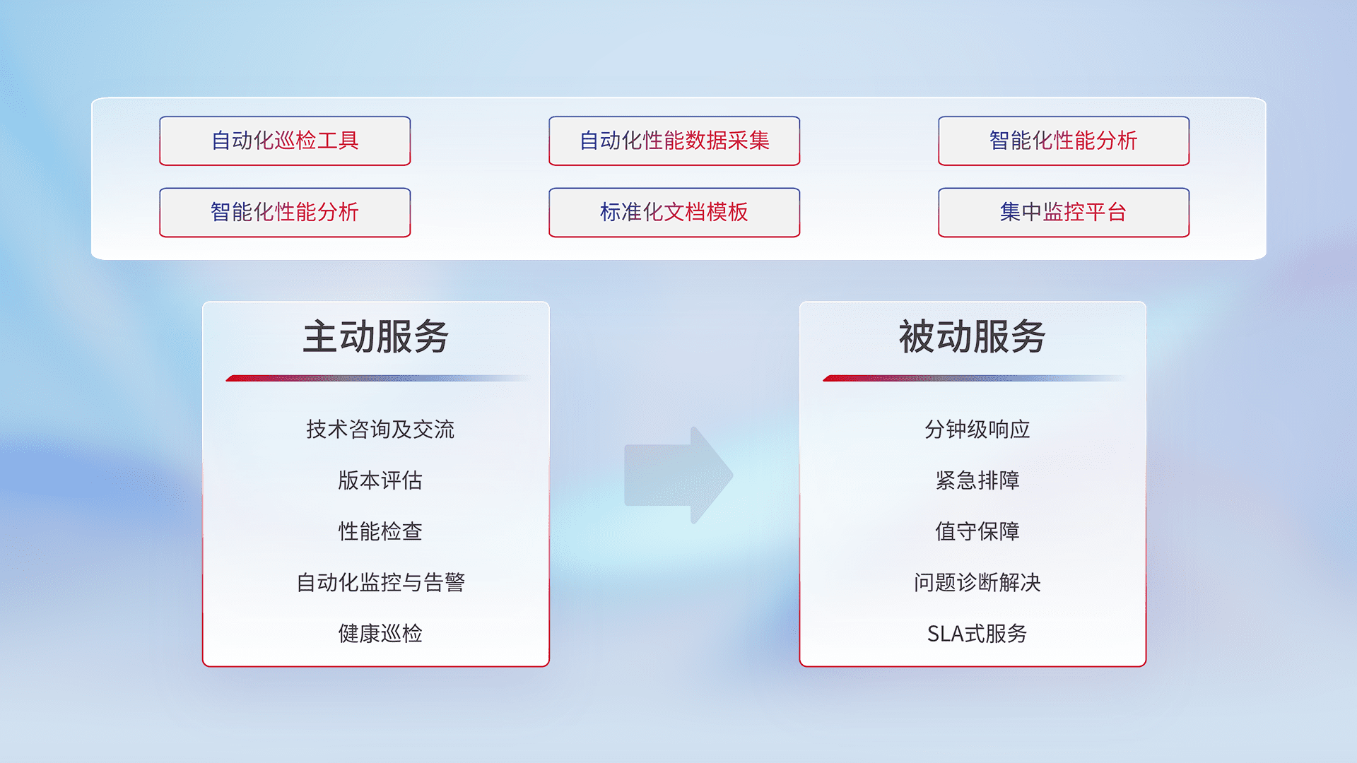 智能化工具和标准化文档,,,保障服务质量,,,,提供主动服务(包含技术咨询、、、版本评估、、、性能检查、、、、自动化监控与告警、、、健康巡检)和被动服务包含(分钟级响应、、、、紧急排障、、、值守保障、、、问题诊断解决、、、SLA服务)。。